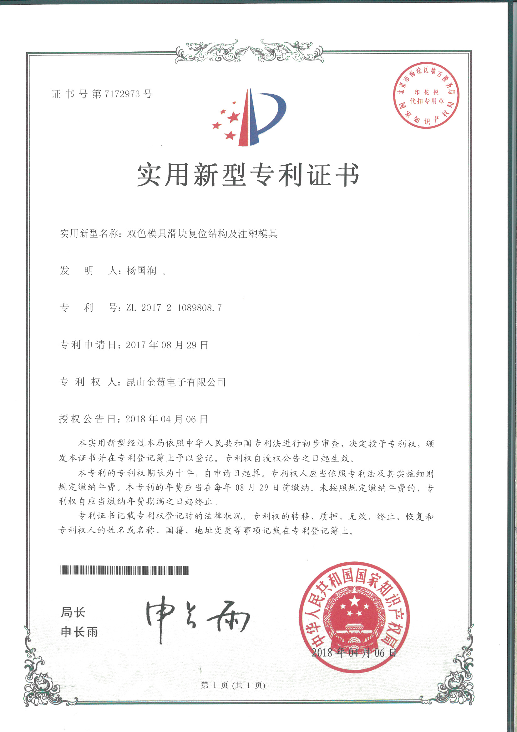 7172973專利號(hào)-雙色模具滑塊復(fù)位結(jié)構(gòu)及注塑模具