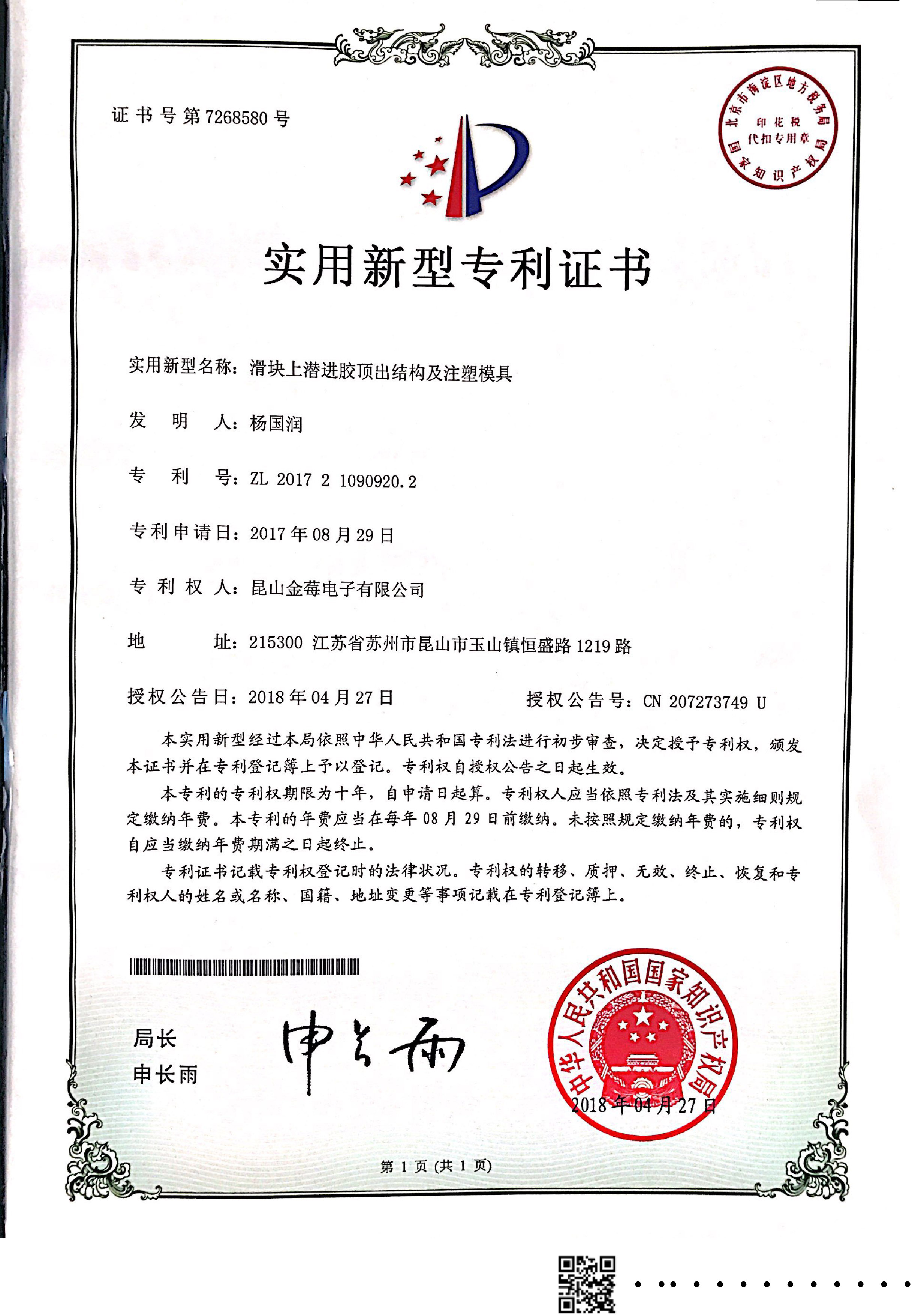 7268580專利號(hào)-滑塊上潛進(jìn)膠頂出結(jié)構(gòu)及注塑模具